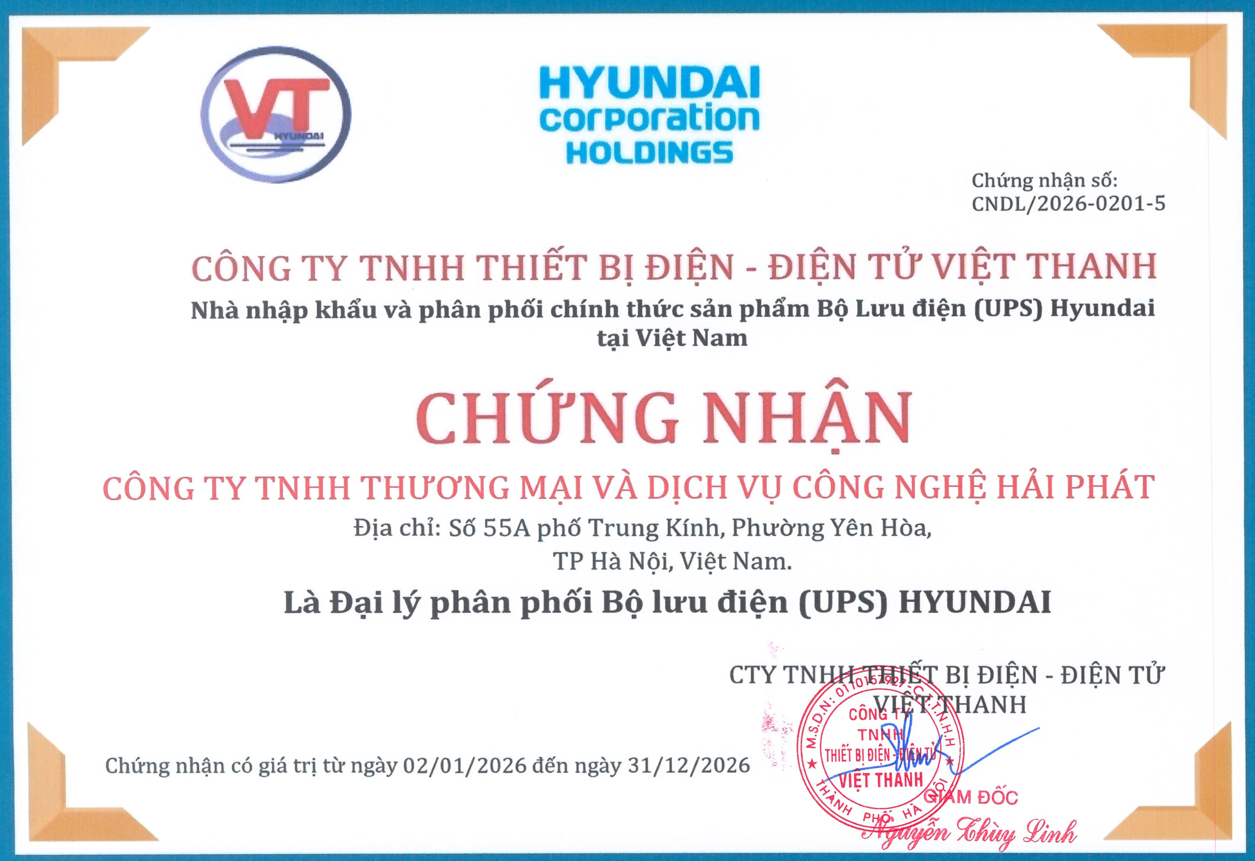 Từ uy tín đã xây dựng của CÔNG TY HẢI PHÁT với hệ thống bán hàng và Dịch vụ bảo hành sản phẩm UPS/bộ lưu điện, sửa chữa UPS chu đáo, CÔNG TY CỔ PHẦN HYUNDAI VIỆT THANH, có trụ sở chính đặt tại B07- Số 15 ngõ 91 phố Nguyễn Chí Thanh, Phường Láng Hạ, Quận Đống Đa, TP Hà Nội, thành viên được ủy quyền hợp pháp chịu trách nhiệm nhập khẩu sản phẩm BỘ LƯU TRỮ ĐIỆN (UPS) – THƯƠNG HIỆU HYUNDAI cho thị trường Việt Nam, đánh giá cao và tiếp tục quan hệ hợp tác và cấp giấy chứng nhận đại lý phân phối các Sản phẩm bộ lưu điện (UPS) thương hiệu HYUNDAI cho đến ngày 31/12/2026.